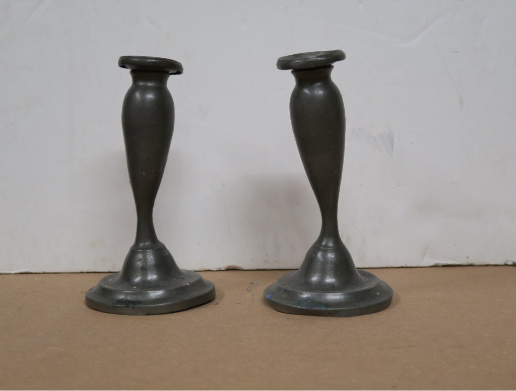 Deze tinnen kandelaars zijn waarschijnlijk gevallen en door de zachtheid van het materiaal vrij ernstig vervormd. De kandelaars waren door de vervormingen wankel en scheef. Daarnaast zat er veel kaarsvet op. Het voordeel van tin is dat het meestal ook weer gemakkelijk terug te vormen is. Met de juiste druk op de goede plek kan het met een paar ingrepen rechtgezet worden.