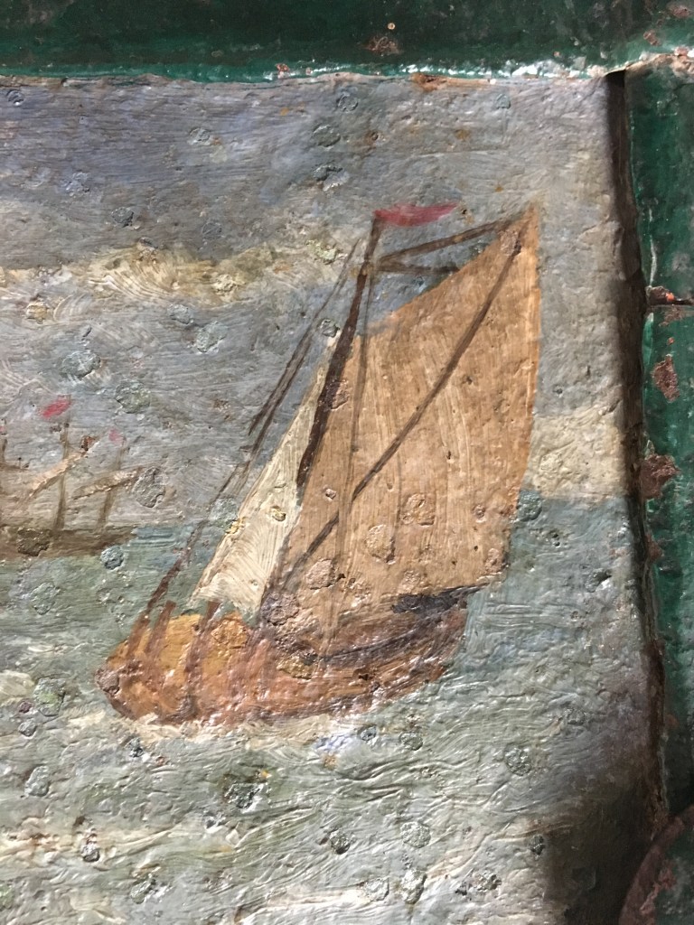 Deze zogenoemde Neurenberger kist was sterk aangetast door de inwerking van een te vochtige omgeving, waardoor zich corrosieblaasjes hadden gevormd die de verflaag weg hadden gedrukt. Uit kostenbesparende overwegingen zijn de lacunes niet gevuld, maar zijn de ontsierende bruine vlekken wel geretoucheerd om het beeld minder storend te maken.